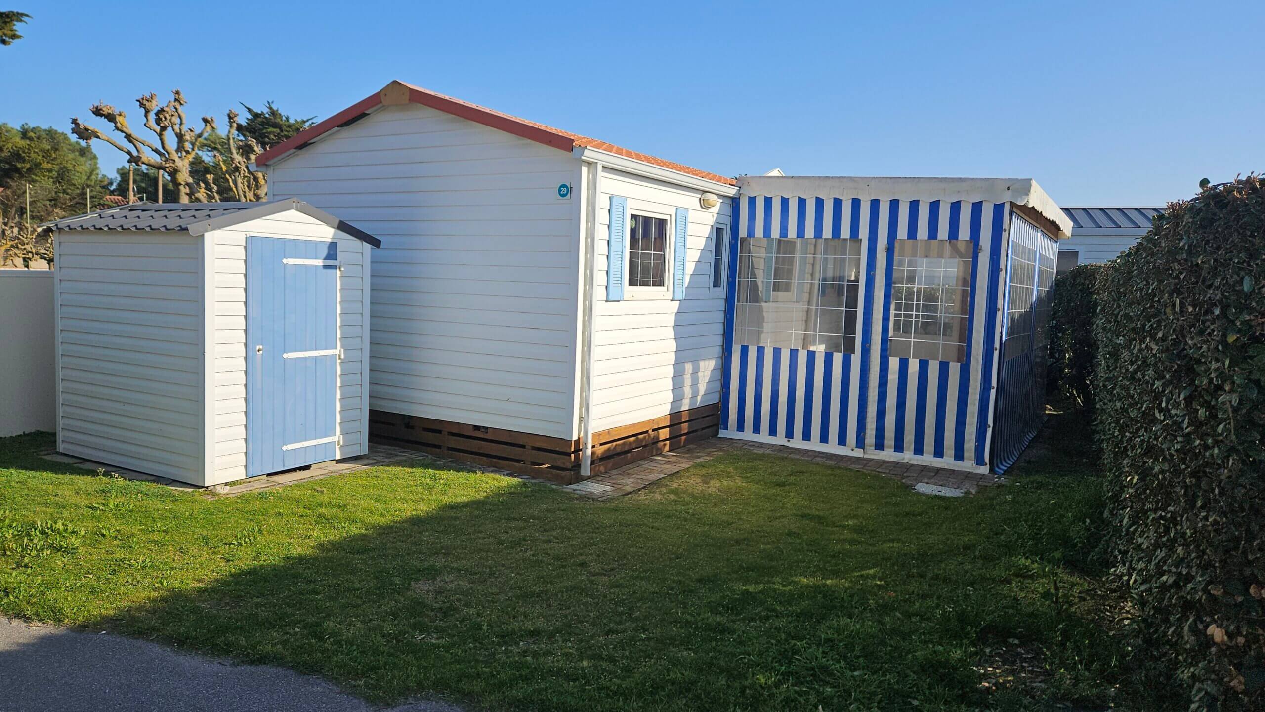 Parcelle de 100 m2 avec chalet de 35 M2. Elle est située à l’entrée du camping près des commerces et de la plage.